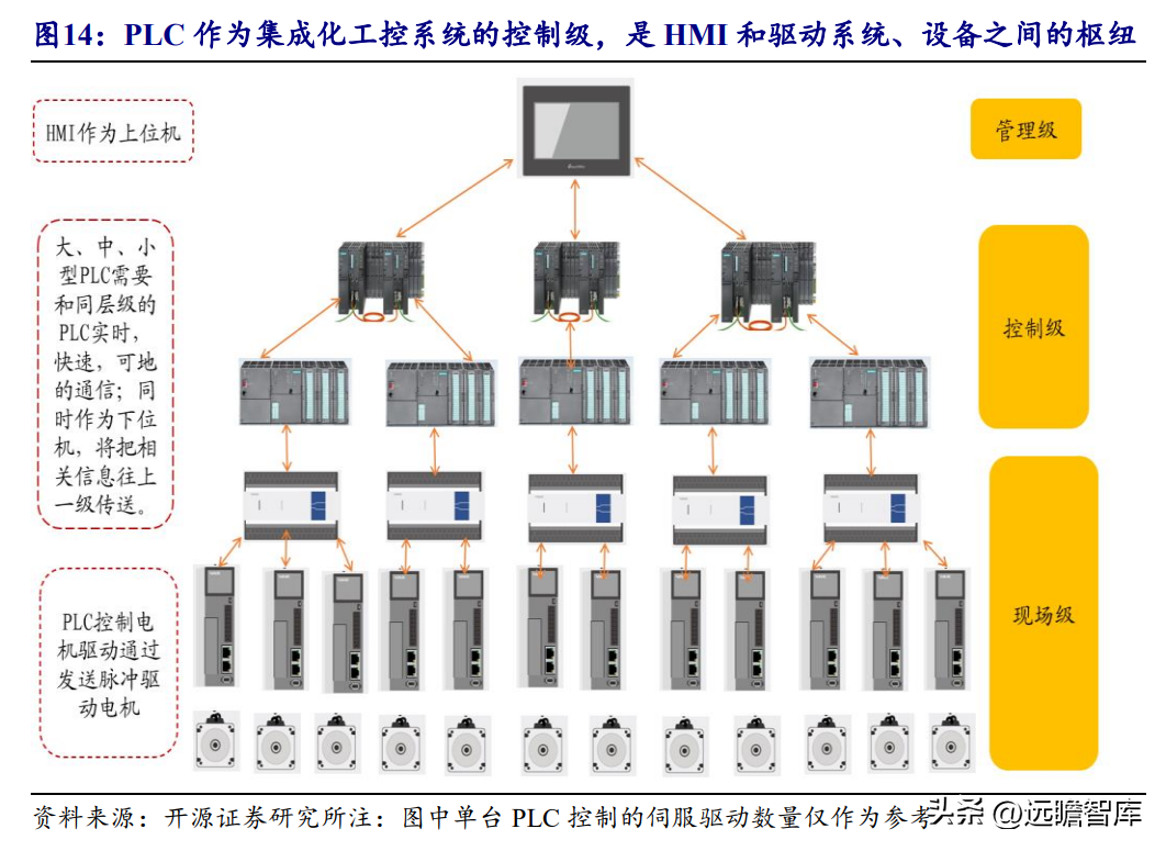 从PLC拓展到伺服系统,公司产品研发的技术路径具备优势。 PLC控制伺服系统的过程是:先根据机械条件,综合考虑精度与速度要求设定好伺服电机的电子齿轮比,再计算需要PLC发出的脉冲频率使PLC输出脉冲,驱动器将脉冲信号进行功率放大,以驱动电动机。
