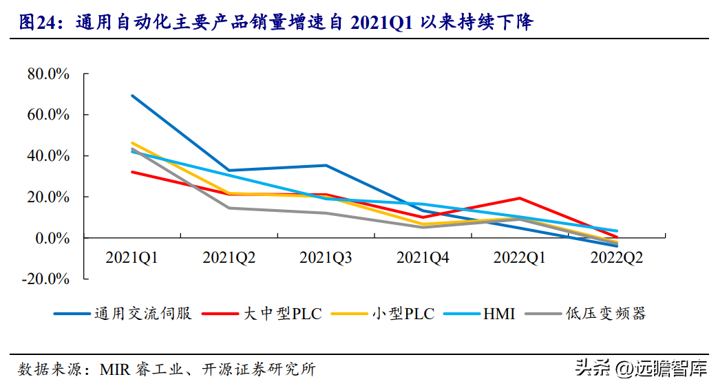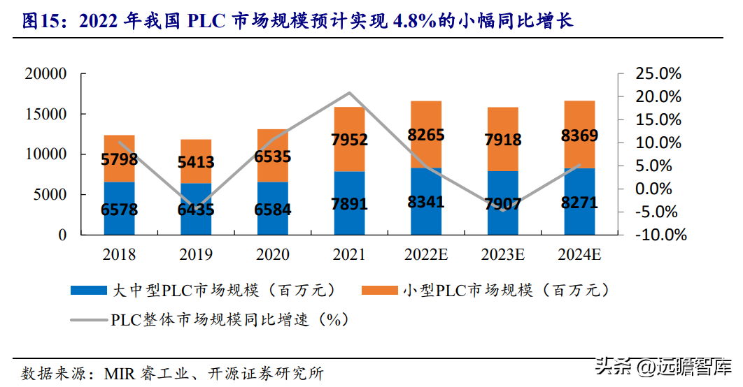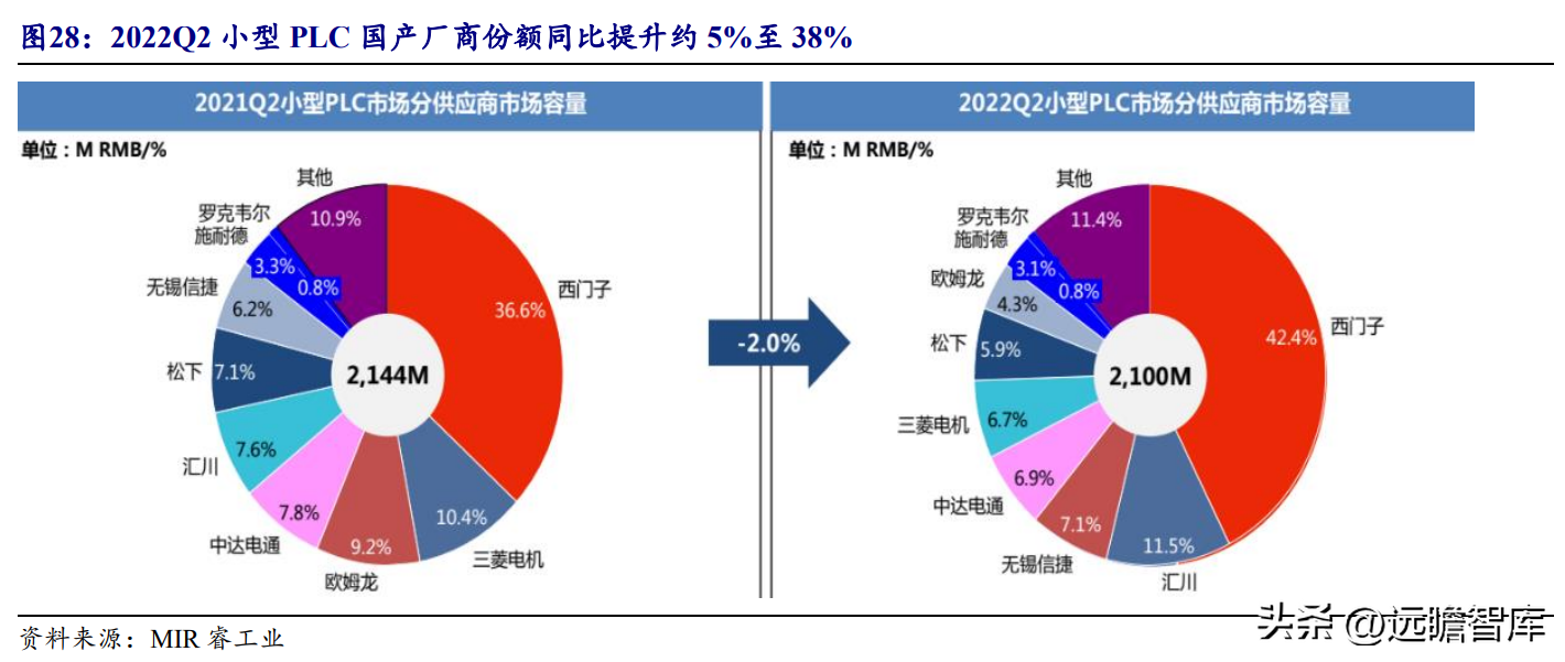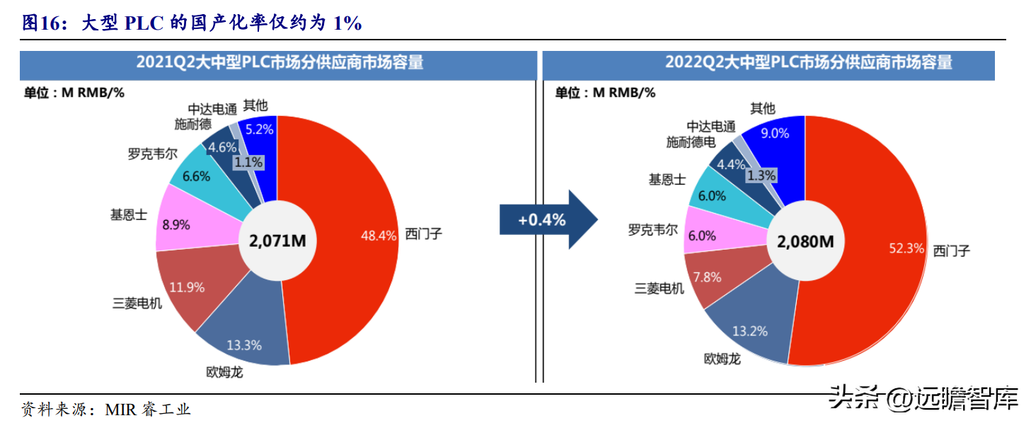根据MIR睿工业数据,2021年我国PLC整体市场规模为158.4亿。2022Q2,芯片缺货、原材料价格上涨以及下游需求收缩对PLC市场影响不减,大中型PLC市场规模同比增长0.4%,小型PLC市场规模同比下降2%。根据MIR预测,2022年全年PLC市场规模仅能实现4.8%的同比增长。