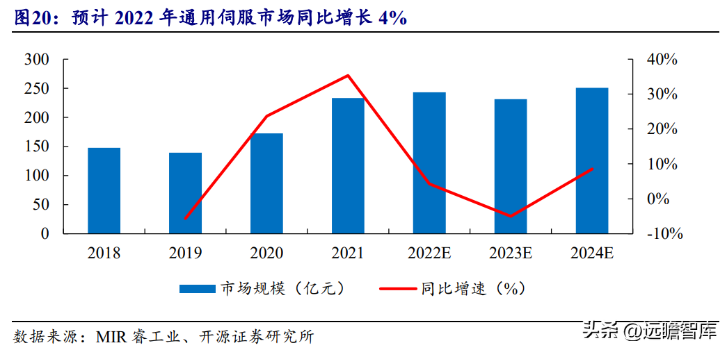 伺服控制系统包括伺服驱动和电机,主要功能是按控制命令的要求、对功率进行放大、变换与调控等处理,使驱动装置输出的力矩、速度和位置控制更加灵活方便。2021年,我国通用伺服系统市场规模达223亿元。2022Q2,在供应链受阻、下游行业需求不振的情况下,我国通用伺服系统市场规模同比下降4%。