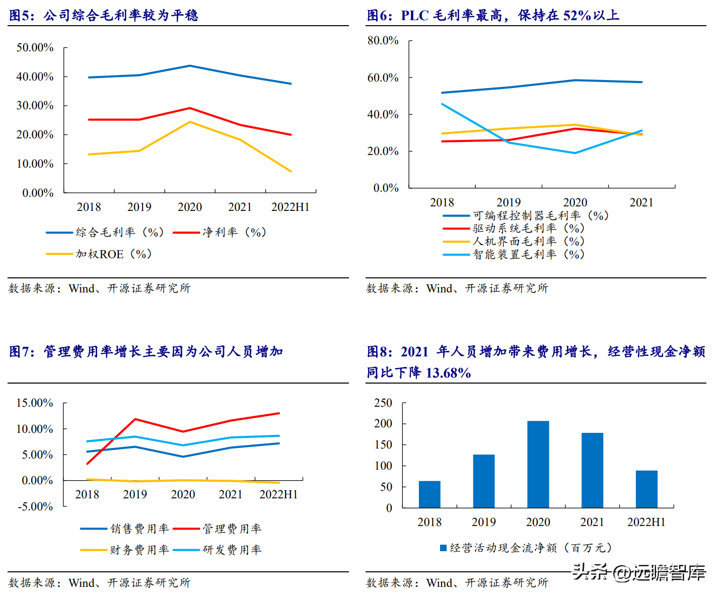 费用率较为平稳,盈利能力良好。 2018-2021年,公司综合毛利率维持在40%左右,其中PLC的毛利率保持在52%以上。2022H1,综合毛利率同比下降3.28pct,主要系公司加大伺服推广力度,对客户有部分让利使得驱动系统业务毛利率有所下降。公司经营活动现金流跟随净利润稳健增长。
