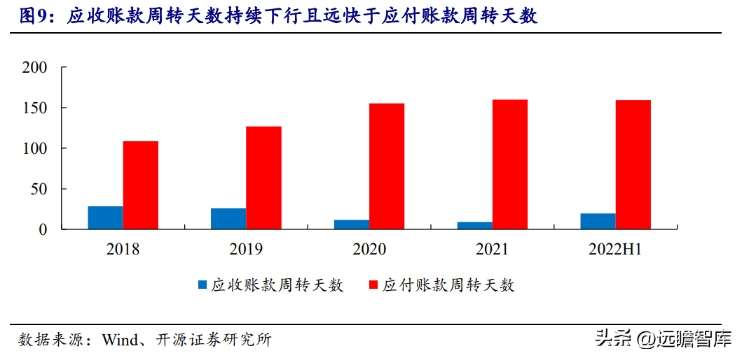 公司产业链议价能力相对较强,营运能力较强。 公司应收账款周转天数自2018年以来持续下行、并远快于应付账款周转天数。2022H1,疫情影响下,公司应收账款周转天数小幅上涨。
