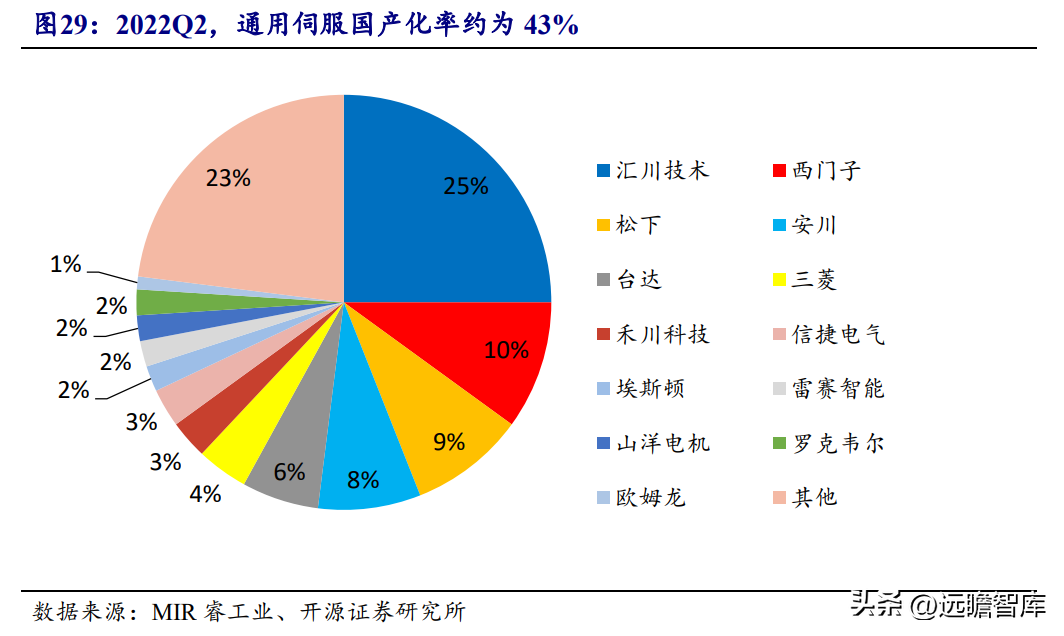 2022Q2,伺服系统国产化率同比提升8%至43%。 同样受到供应链不畅、缺芯的影响,日系品牌安川、三菱、松下市场份额分别同比下降35%、40%和18%;国内伺服厂商则以较短的货期和充足的备货扩大自身竞争优势,市场份额均实现增长。2022Q2,信捷电气伺服系统销售额同比增长16.9%,市场份额同比小幅提升1pct。