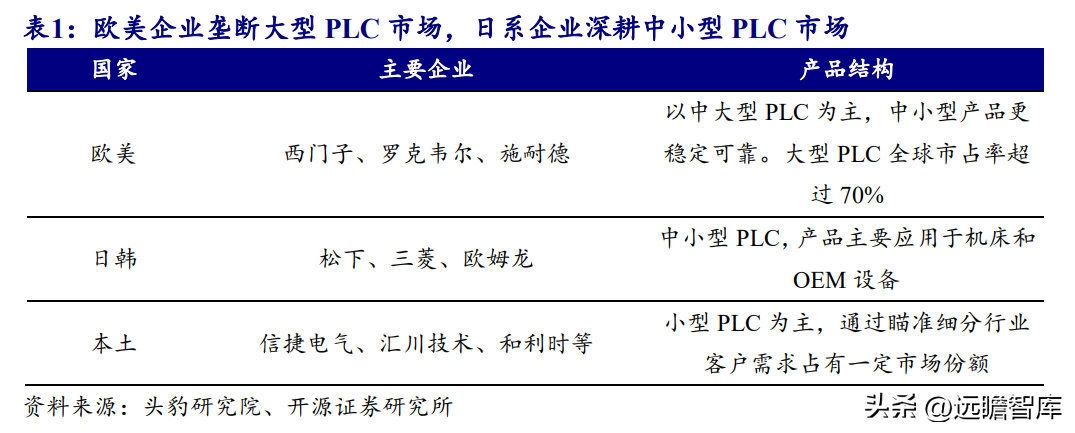 第一,PLC在整个自动化设备里的成本占比低。仍以锂电设备为例,一台锂电设备售价几百万,而一台PLC售价1-2万,占设备总成本3%以内的比例。假设由于芯片涨价导致PLC涨价20%,对整体设备成本来讲只是不到1%的成本增长。第二,切换PLC的机会成本很高。对于设备厂商来说,切换PLC需要重新编写程序,验证稳定性、验证性能。由于PLC是保证工业生产安全的重要零部件,一旦因切换PLC使得设备出现问题,会严重阻碍工业生产的顺利进行。因此,切换成本比PLC涨价带来的成本大很多,PLC厂商对下游客户的议价权较强,芯片等原材料涨价给PLC厂商带来的成本增长可以顺利传导给下游客户,从而维持毛利率稳定。2.2、行业竞争呈现德美日三雄鼎立的局面,PLC国产替代空间广阔
