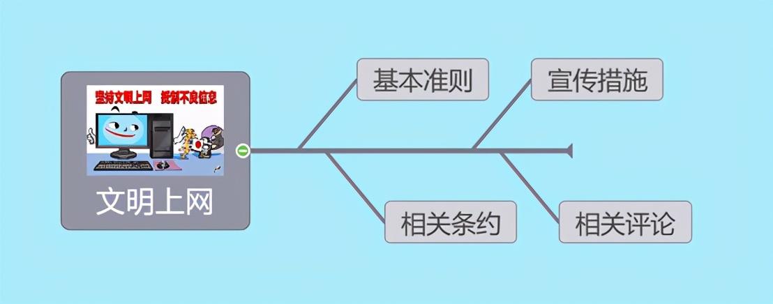 4、新建页面为课件第三页 ,插入如下图思维导图样式,在“文明上网”处添加多媒体(图形文件存于R:\技能测试\wmsw.jpg),给整个思维导图设置动画为“放大”;展开方式为逐个展开。(10分)