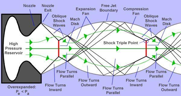 火箭是由于喷射气体而产生推力运动的,但是它们的扩散速度并没有火箭快。当气体过度膨胀时,与外部大气相比,排出的气体压强较低,导致排气被向内挤压。这种压缩增加了排气的压力,但是,气流可能被压缩得太多,以致其压力超过大气压。结果,气流再次向外膨胀以减小压力。