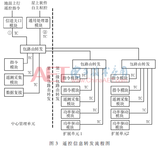 扩展单元路由模块根据接收到的遥控包“APID”域,对遥控包的目的地址进行识别,进一步转发至单机内部模块;单机内部的遥控包转发和重发与管理单元一致。