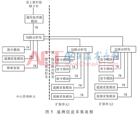 从遥测信息流实现过程也可以看出,在两级路由架构下,管理单元自身模块的遥测数据相对当前状态存在1个星上软件程控周期的延时,而扩展单元的遥测数据则存在2个周期的延时。