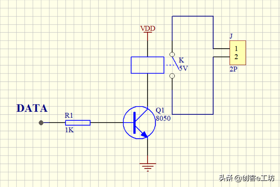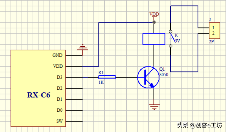 由于这个接收模块的数据脚输出电流很小,驱动能力有限,不能直接驱动继电器,所以我们还需要给它加一级三极管放大电路,如下图: