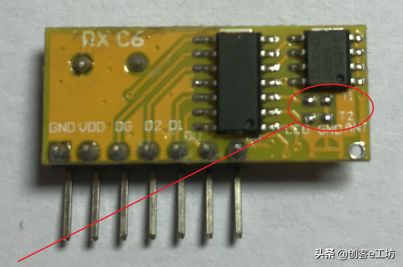 我们将T2焊上,将模块的输出方式改为自锁,接下来DIY一个无线遥控开关。为了增加遥控距离,焊上一段大约17cm长的单芯导线。