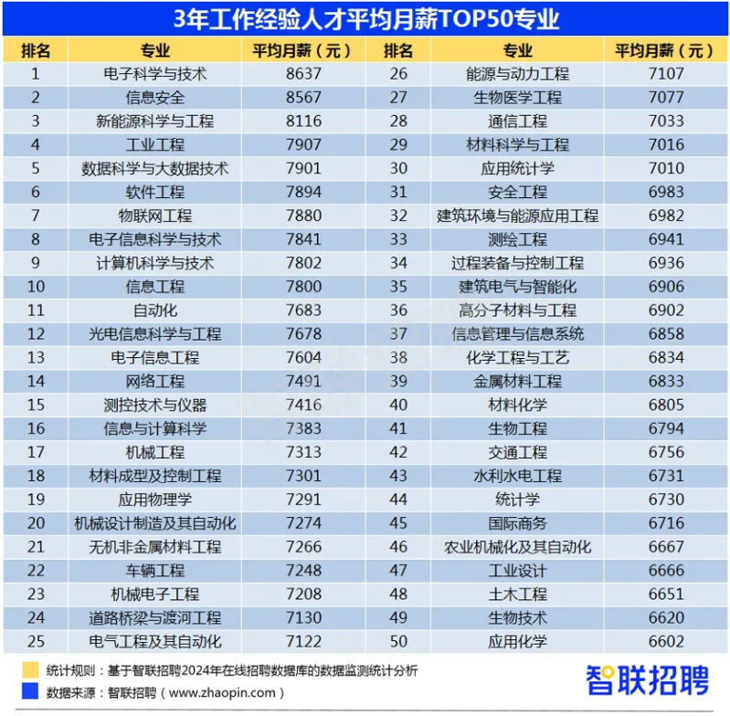 在薪酬方面,工科专业毕业生占据了薪资排行榜的绝大多数位置,电子科学与技术、新能源科学与工程等专业成为高薪的代名词,平均月薪分别达到8637元与8116元,反映了社会对技术创新和可持续发展领域的高度认可。相比之下,医学专业并未进入薪酬前50名,而计算机类专业虽然曾经风光无限,如今排名有所下滑,提示着行业动态变化对专业“钱景”的直接影响。
