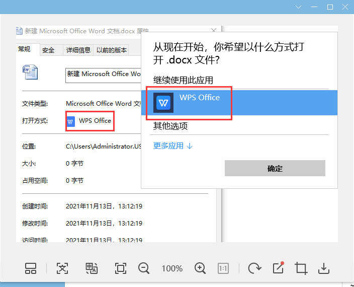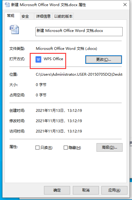 第二步,点击更改按钮,选择打开方式为WPS Office 后确定。就会发现该文档的打开方式已变为 WPS Office
