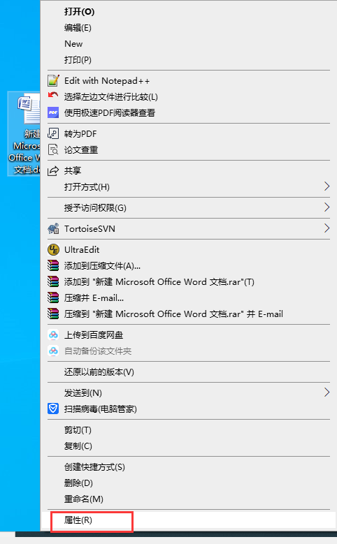 第一步选择world文档,右键点击属性