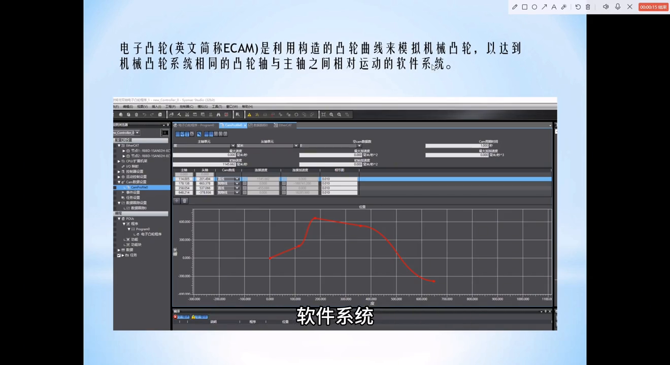 那么,什么是电子凸轮呢?电子凸轮是一种软件系统,利用构造的凸轮曲线来模拟机械凸轮,以达到机械凸轮系统相同的凸轮轴与主轴之间相对运动的效果。需要注意的是,最后四个字是“软件系统”。电子凸轮表可以自定义曲线,有直线、抛物线等多种类型,用户可以根据需求计算出相对点位,并使用凸轮表来实现所需的效果。