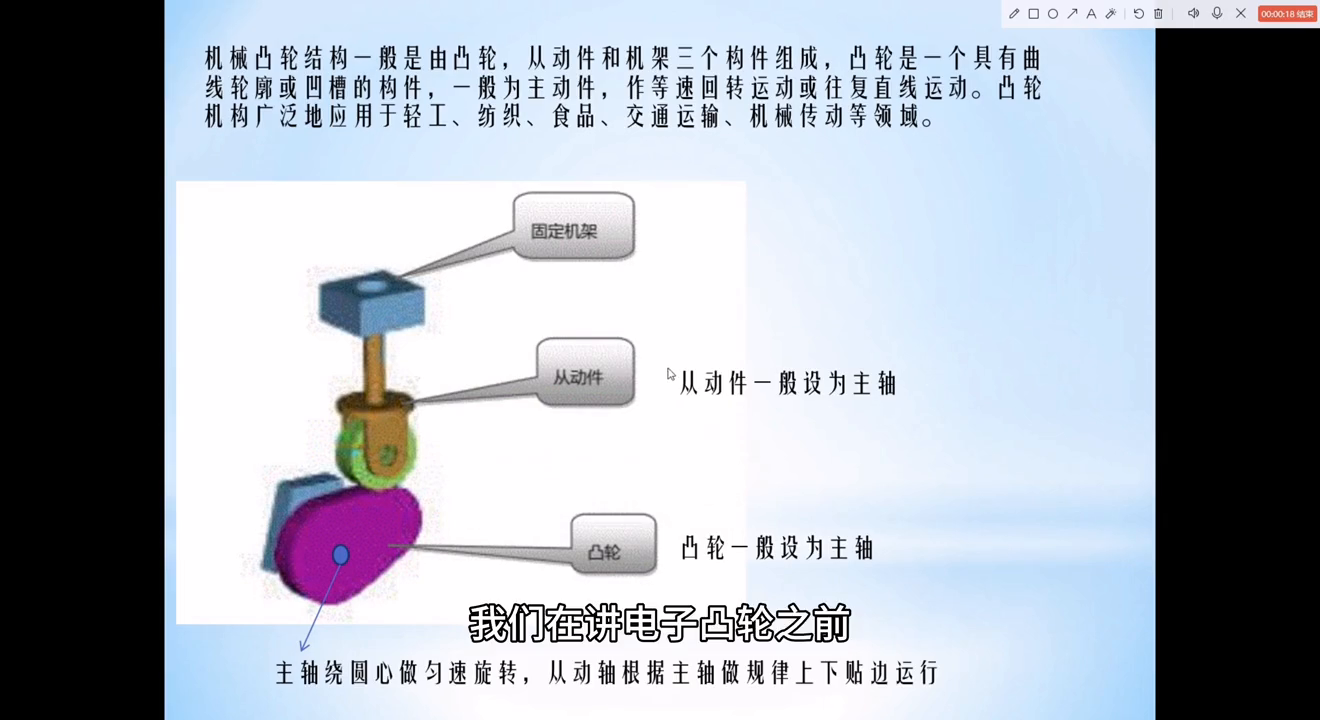 在讲解电子凸轮之前,我们需要了解机械凸轮的基本原理。机械凸轮通常由凸轮、从动键和固定机键三个部分组成。凸轮是一个具有曲线轮廓和凹槽的构件,通常以主动键的形式实现等速旋转或直线往复运动。例如,图中所示的是一个等速旋转的凸轮。锥剪和非减都是往复直线运动的例子。