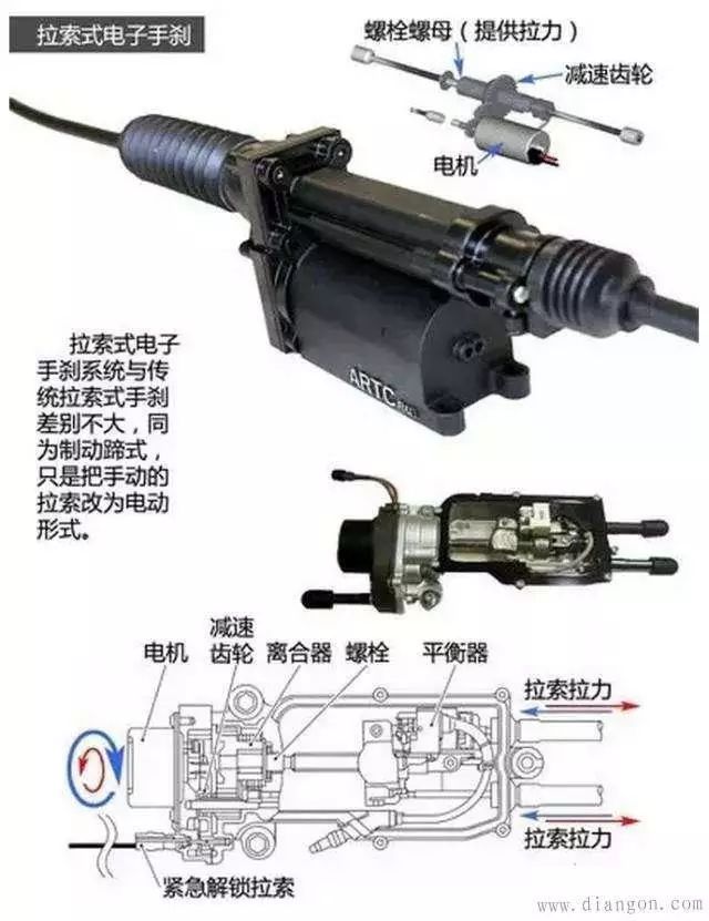 如今在汽车上应用的电子手刹技术一般分为两种,一种是与机械手刹更为接近的拉线式驻车系统,而另一种则是与刹车卡钳集成在一起的驻车系统。