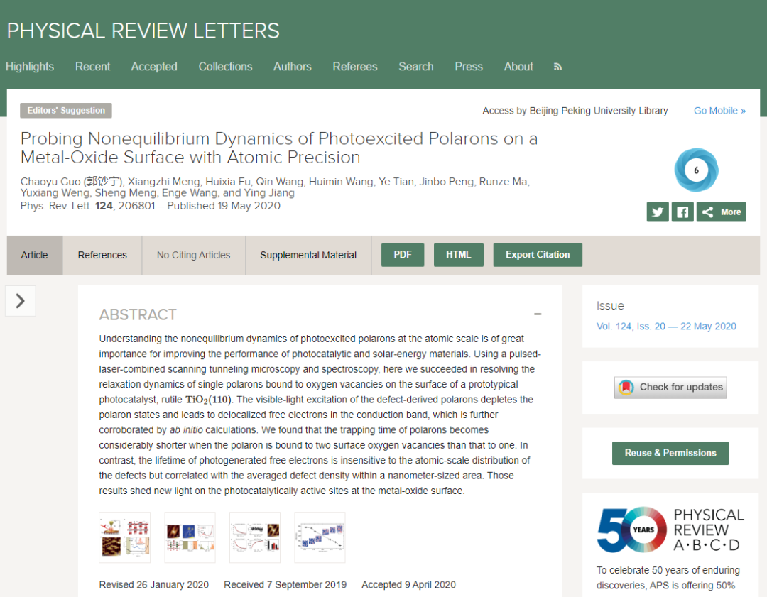 这项工作得到了国家自然科学基金委、科技部、中科院、北京市科委的经费支持,以“Probing non-equilibrium dynamics of photoexcited polarons on a metal oxide surface with atomic precision” 为题,于5月19日发表在物理领域顶级期刊《物理评论快报》【Phys. Rev. Lett. 124, 206801 (2020)】上,并被选为编辑推荐文章。