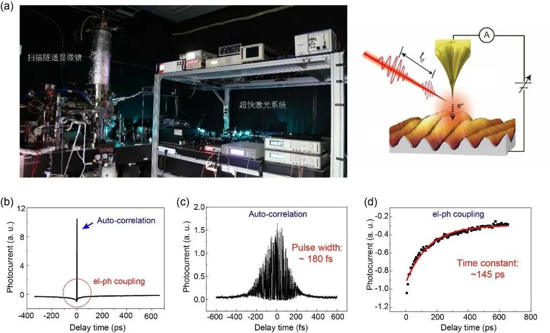 a:飞秒激光耦合的扫描隧道显微镜系统;b:激光诱导的针尖光电流与激光脉冲延迟时间的依赖关系;c:激光诱导光电流的自相关函数,表明时间分辨率优于180fs;d:干涉区域外光电流与延迟时间的关系,对应于声子抑制的光电流发射过程,时间常数为~145ps。
