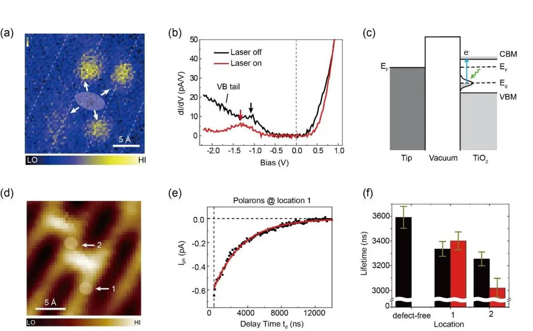 a:TiO2(110)表面氧缺陷附近的极化子分布;b:极化子位点处在激光照射前后的扫描隧道谱,表明光照下极化子被激发为导带自由电子(图2c);d:两个氧缺陷的STM形貌图,位点1和2分别标注了两个极化子位点;e:位点1处自由电子被氧缺陷捕获形成极化子的时间分辨曲线;f:不同位点处导带电子寿命(黑色)和极化子被氧缺陷捕获的时间(红色)。