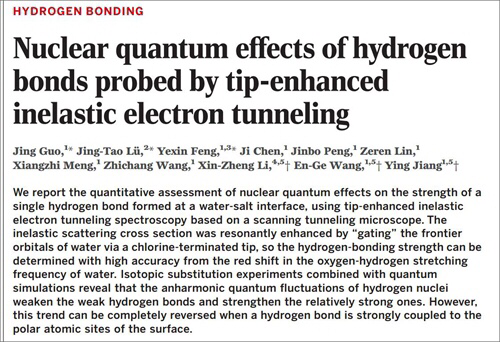在相关实验技术方面,团队发展了一套“针尖增强的非弹性电子隧穿谱”技术 ,获得了单个水分子的高分辨振动谱,并由此测得了单个氢键的强度;在理论方法上,开发了基于第一性原理的路径积分分子动力学方法 ,实现了对电子量子态和原子核量子态的精确描述。