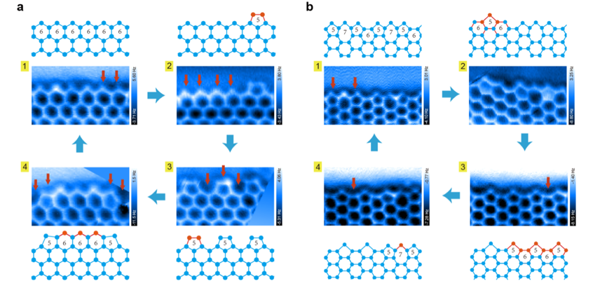 二维冰岛的锯齿状(a)边界和扶椅状(b)边界对应的“搭桥”(bridging)式和“播种”(seeding)式生长模式。生长由1至4依次循环进行,原子力显微镜中的红色箭头表示水分子加入,球棍模型图中的红色结构表示水分子加入形成的新结构。图像尺寸分别为:(a)3.2nm x 1.9 nm和(b)3.7nm x 2.2 nm