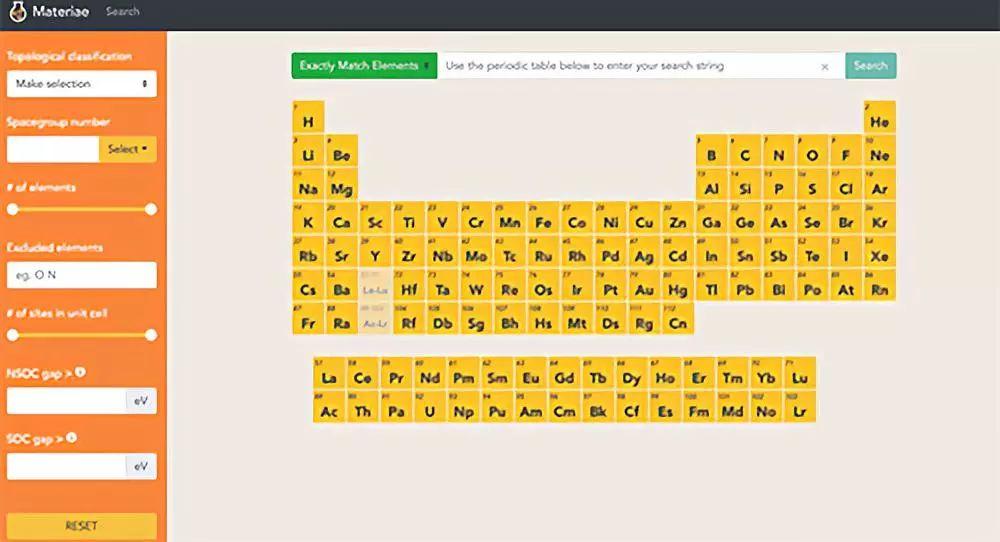 图4:中科院物理所-中科院计算机网络信息中心合作建立的在线数据库(Materiae),在元素周期表中点选材料,在左边输入(可选)筛选条件,然后按下搜索键即可得到含有这些元素的所有拓扑材料的列表。该网站的网址为http://materiae.iphy.ac.cn。