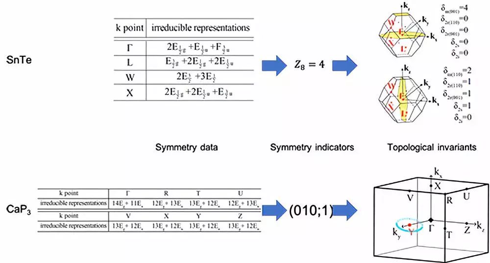 图2:“拓扑词典”的使用方法。对于给定的材料(上为碲化锡,下为三磷化钙),先通过第一性原理计算软件获得所有的对称性数据(symmetry data),这个对称性数据就是我们要查的“词”。接下来由对称性数据,先转换成“对称性指标”,再进而得到所有可能的拓扑不变量(即词典中的“义”)。注意,对于弱自旋轨道耦合的体系(如下面一排),该词典给出的“义”则是拓扑能带交点在动量空间的可能构型。