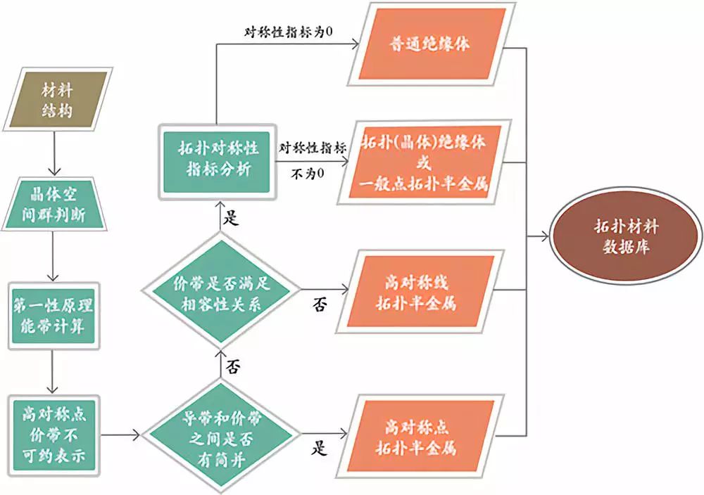 图3:文献【1】中所使用的自动计算任意晶体材料的自动化流程。其中棱形的绿色模块表示逻辑判断,而平行四边形的橙色模块则代表输出结果。根据这一流程,对于任何一个材料,我们都会得到一个确定的“标签”,这个标签告诉我们这一材料是否属于拓扑材料,以及属于哪一种拓扑材料。这里对于任何材料,文献【1】都分别考虑了有自旋轨道耦合和无自旋轨道耦合两种设置,这是与文献【6,7】有所区别之处。