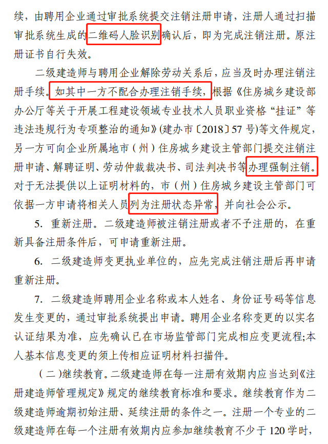 二级建造师实行注册执业管理制度,取得资格证书的人员,经过注册方能以二级建造师的名义执业。二级建造师申请注册前,应当受聘于一个建设工程施工、勘察、设计、监理、招标代理、造价咨询等单位。二级建造师与聘用企业解除劳动关系后,应当及时办理注销注册手续。如其中一方不配合办理注销手续 ,另一方可提交注销注册申请、解聘证明、劳动仲裁裁决书、司法判决书等办理强制注销 。对于无法提供以上证明材料的,可依据一方申请将相关人员列为注册状态异常 ,并向社会公示。目前,大多数省市都已实现了二级建造师执业资格注册等业务实现全程网办 ,而注册个人账号需要进行实名认证 ,方可进行二建注册等业务,这样意味着在省内二级建造师注册数据全面互通,在省内是否重复注册,一目了然,查“挂证”更加简单了 。