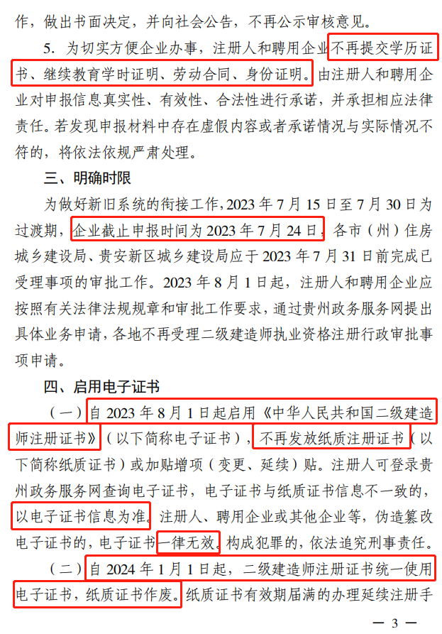 贵州省二级建造师执业资格认定 工作有关事项,自2023年8月1日起由贵州省住房和城乡建设厅统一实施,不再由各市(州)实施。2023年8月1日起,注册人和聘用企业应通过贵州政务服务网提出具体业务申请,各地不再受理。02启用电子证书,明年起纸质证书作废!