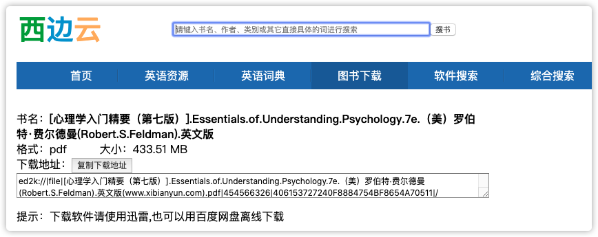 所以大家可以通过迅雷或者百度网盘的离线下载功能,直接下载搜索出来的书籍,这样就可以避免图书资源和谐失效等问题。