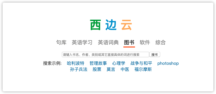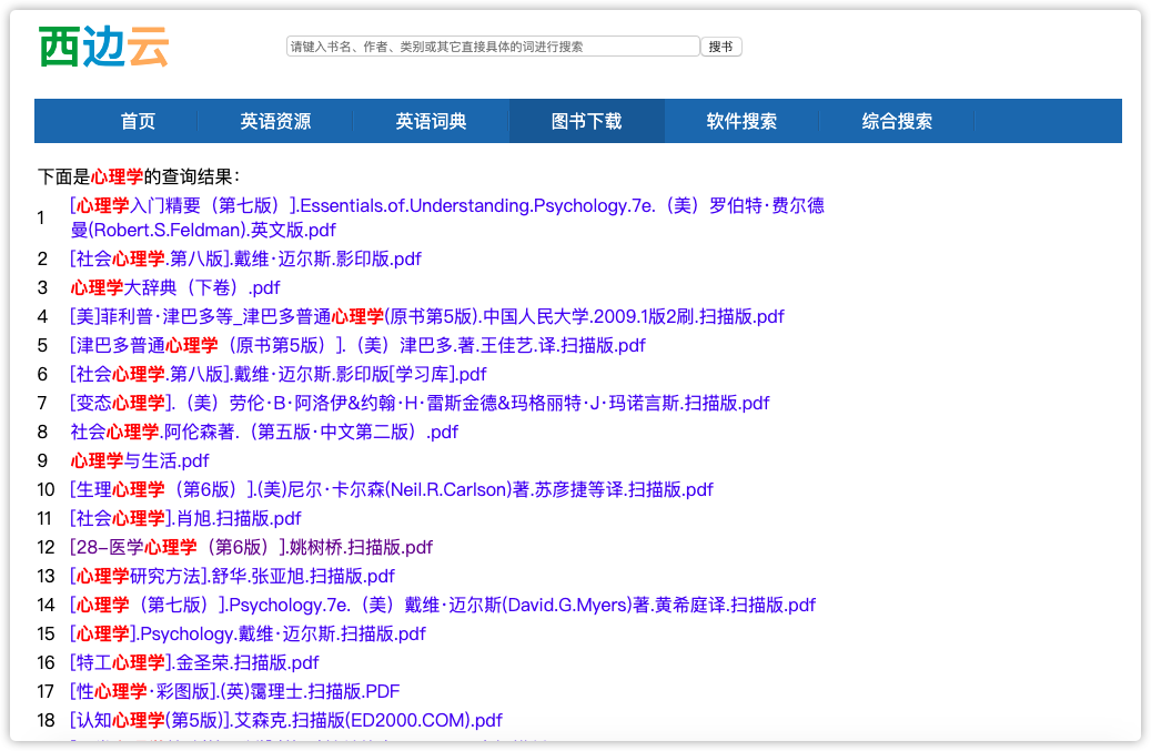 西边云是一个综合类的搜索引擎,和鸠摩搜书不同的是它除了可以搜索图书还可以搜索句库,英语词典等学习资料,亲测图书的搜书效果很棒,网站不提供高资源,只提供搜索引擎,搜出来的图书格式为PDF。