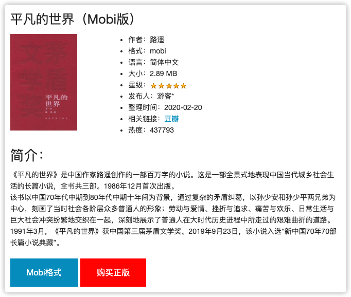 例如这本“平凡的世界”,打开后就可以查看书籍的作者和格式,也可以查看书籍的简介,点击下载即可直接下载到手机或电脑,也可以点击购买正版到亚马逊商城中进行购买,具体看大家的需求,土豪可以直接去亚马逊购买。