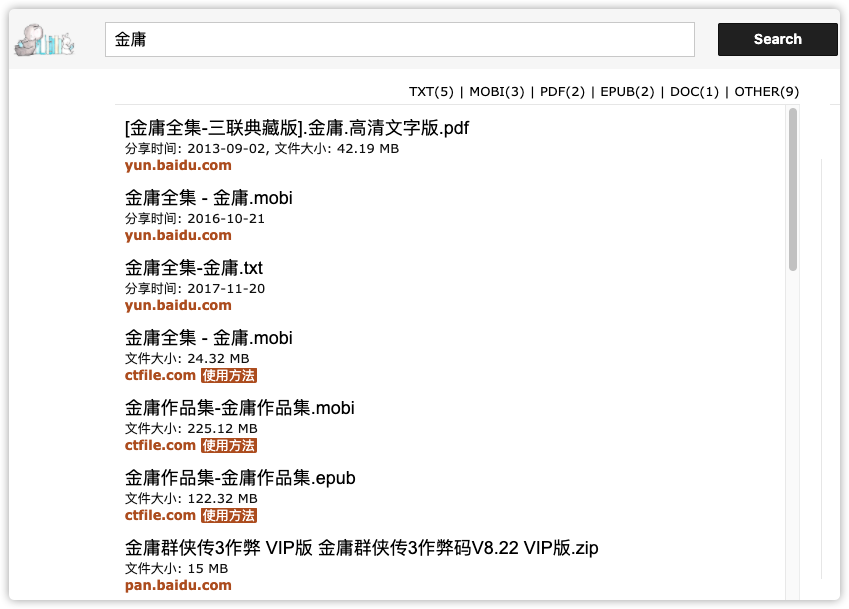 网站的搜索引擎基于雅虎和必应,搜出来的书籍资源格式丰富,基本囊括了现在主流的电子书格式,这里小佳以武侠大家金庸先生为例。