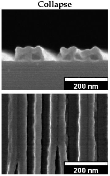 坚膜又称硬烘,目的是通过烘烤使光刻胶胶模中残留的显影液和定影液挥发出来,同时提高光刻胶与基片之间的结合力,烘烤的温度时间视光刻胶的种类及旋涂后的胶膜厚度而定,如果坚膜不到位可能会出现胶膜倒塌的情况,如下图所示。