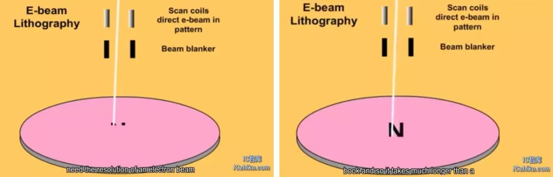 直写式光刻不需要掩模版,通过磁场直接控制电子束斑按照预设的轨迹在光刻胶表面照射,完成图案转移,就像是画画,铅笔类似于电子束,纸类似于光刻胶,而我们的手类似于磁场,通过手控制铅笔的移动完成图画的绘制。