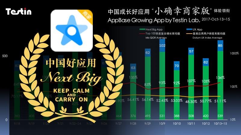 2017年10月13~15日,AppBase中国成长好应用日报显示Testin云测平台新增独立成长应用数量为539,其中用户体验基准应用数量85,Top 100 Mix QGR季度复合增长率均值134%,用户体验基准应用UX均值51.11,「小确幸商家版」用户体验系数为83.31,在当日新增独立成长应用中体验系数占据榜首。