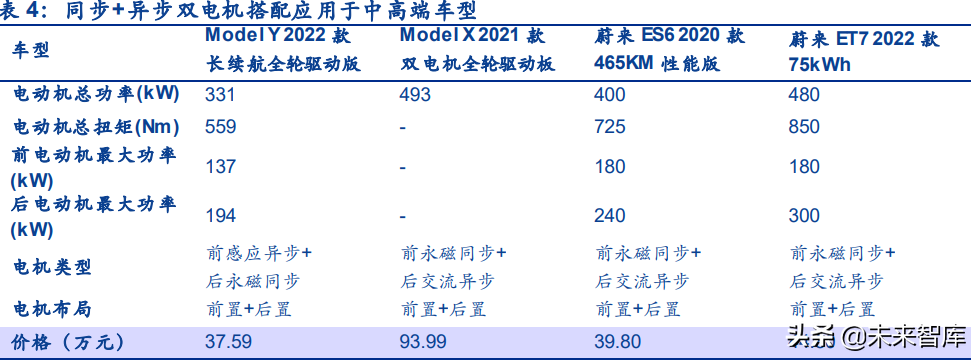 双电机搭配分别满足低速与高速运转工况,并在一定范围内同时工作提高输出功率,兼顾低 速爬坡和高速续航,从根本上改变了新能车机动性能。相比单电机方案,双电机方案具有以 下优势:1)在整个运行过程中动力无中断,连续无卡顿;2)提升整车系统效率的同时获得 更大扭矩;3)降低电机单体的制造难度与开发成本;4)提高制动能量回收的效率。其中不 同功率的同步电机与异步电机搭配可以做到优势互补,被中、高端车型广泛应用,如特斯拉 model Y、model X、蔚来 ES6、ET7 等,同步电机与异步电机搭配逐渐成为核心配臵。为 解决续航问题同时满足高性能的追求,双电机驱动在中、高端车型中广泛应用,2021 年销 量前 5 款热销车型中有 4 款配有双电机升级版,我们认为双电机占比有望逐步提升。(报告来源:未来智库)