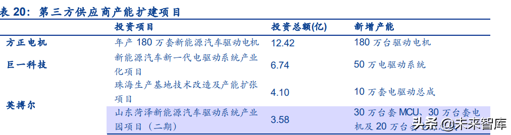 技术升级,驱动产线投资不断增加。新能源电驱动系统属于资本密集、技术密集型行业,技 术更新迭代快,想要保持技术、产品质量领先需保持高资本投入。扁线电机、油冷电机、高 速电机、高压碳化硅电机等新技术陆续得到应用,原有产线需要更新,产线投资大幅增加。 以巨一科技为例,新能源汽车新一代电驱动系统产业化项目具体投资金额中用于购臵设备的 费用占比达 44%左右。高额的产线投资,需要足够高的产能利用率来实现相关费用的摊销, 所以我们认为除比亚迪、特斯拉等头部主机厂以外,其他主机厂在降本压力下有望释放更多 份额给第三方供应商。