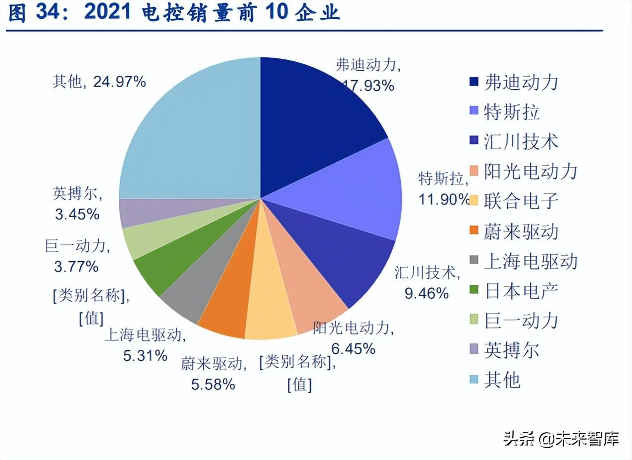 2021 年电驱动行业有以下几个特点:从市场集中度来看,2021 年电机电控销量前十的企业 占据约 75%左右的市场份额,销量前三的企业约占 40%左右的市场份额,行业集中度较高。 从供应商类型来看,销量前十的企业中有三家为主机厂,其中比亚迪市场份额约占 18%,排 名第一;特斯拉市场份额约12%,排名第二;蔚来市场份额约6%,三者市场份额合计约35%。 其余七家均为第三方供应商,合计约占 40%左右的市场份额,除去第三方电机龙头方正和第 三方电控龙头汇川 10%的市场份额以外,其余六家份额较为平均。从内资外资来看,销量前 十的企业中只有三家外资企业,分别是特斯拉、联电和日电产,三者合计份额约 22%;其余 七家均为内资企业,合计份额约占 53%。