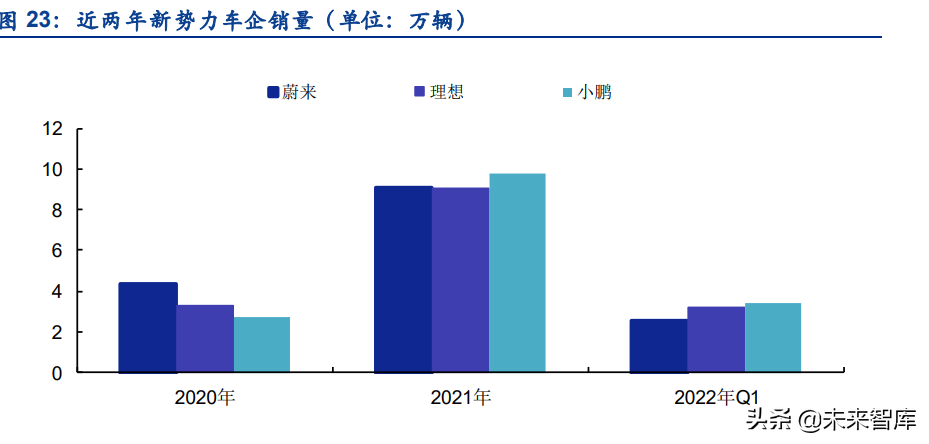 传统自主品牌和新势力高端化加速。随着国内新势力车企和自主车企的品牌力和新能车的产 品力加速崛起,国内车企高端化趋势确定性强。2021 年蔚来、小鹏和理想合计销售车型约 38 万辆,同比增速超过 250%,其中蔚来车型主要包括 EC6、ES6 和 ES8,价格区间在 40~60 万元;理想 ONE 的价格约 35 万元;小鹏主要车型有 P7,价格在 20 万元以上。自主品牌中, 比亚迪汉、极氪 001 等车型定价也均在 20 万元以上,经过 5 年的高速发展,国内车企的新 能车车型迎来高端化的契机,随着产品力和消费者偏好的变化,国内车企的中高端新能车占 比有望持续提升。