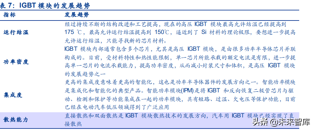 IGBT 模块将多个 IGBT 芯片以绝缘方式组装在金属基板上,用空心塑壳封装,用高压硅脂或 者硅脂作为绝缘材料,主要优势包括:1)温度一致性更好,IGBT 模块将多个 IGBT 芯片组 装同一个金属基板上,相当于在独立的散热器与 IGBT 芯片之间增加了一块均热板;2)参数 一致性更好,模块内的多个 IGBT 芯片经过了模块制造商的筛选,参数一致性比市售分立元 件要好。综合来看,IGBT 模块的方案相对较为成熟,稳定性相对较高,新能车电控中渗透 率较高。但是 IGBT 模块作为标准模块,在电动汽车驱动电机控制系统中存在不同功率应用 时容易出现容量受限及结构安装等问题。