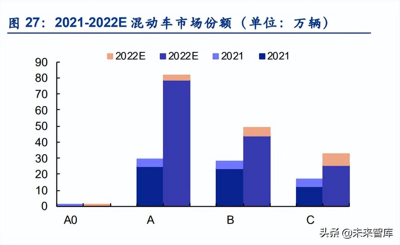 纯电动车型,2021 年自主品牌的 A00 级和 A0 级车型销量约 93 万辆和 20 万辆,在细分车 型中的占比超过 90%,A 级车销量约 55 万辆,占比约 83%,B 级和 C 级车分别为 21 万辆 和 14 万辆,占比分别为 29%和 87%。我们分拆了市场上所有在售纯电动车型的销量,预计 2022 年分车型来看,A/B/C 级车型的销量分别为 88/47/40 万辆,市场份额分别提升到 79%/40%/89%。纯电动自主品牌份额和销量的增量主要来自 A 级以上车型,下游自主品牌 销量的份额逐步提升,产品结构有望逐步高端化。