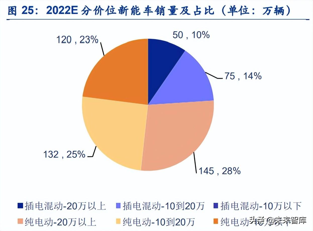2021 年,10 万元以下的纯电动车销量约 108 万辆,占新能车总销量的份额最大,接近 34%, 其次是20万以上的车型,约占27%,20万以上和10至20万的插电混动车型分别约占9.75%、 8.49%的份额。根据目前国内主要自主品牌和合资品牌新车型的规划,新车型主要以 B 级和 C 级车为主,B 级车和 C 级车的销量占比有望逐步提升,A 级以下车型通过过去几年的高增 长,基数和渗透率已经达到较高水平。 综合来看,随着国内蔚来、小鹏和理想等新势力车企的新产品周期陆续推出,以及比亚迪长 城等自主品牌的中高端车型上市,10-20 万车型有望成为新能源汽车渗透率提升的主驱动力; 20 万以上的车型的放量,有望逐步改变国内新能源汽车的销量结构,国内车企在中高端新能 源汽车销量中的占比有望加速提升。
