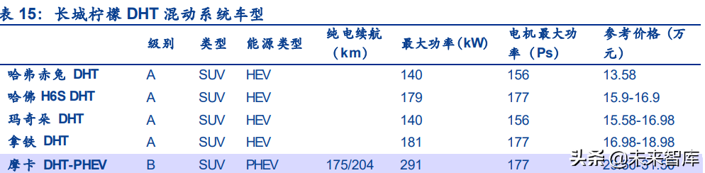 2)长城柠檬 DHT 混动系统:技术路线方面,长城汽车柠檬混动 DHT 的整个系统架构可概 括为"1-2-3",即一套 DHT 高集成度油电混动系统、两种动力架构、三套动力总成,其涵盖 了 HEV 和 PHEV 两种方案,以及灵活应用在 A、B、C 级车型上。结构方面,长城柠檬混动 DHT 以“七合一”高效能多模混动总成为核心,主要包括 1.5L/1.5T 混动专用发动机、定轴 式两档变速箱、GM/TM 双电机。