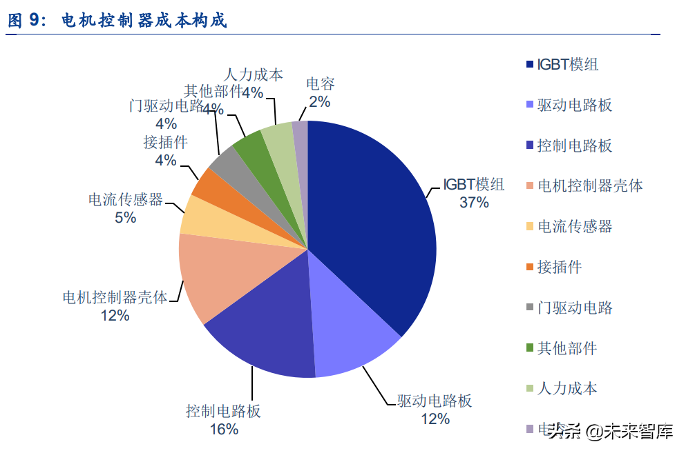 成本端:以 IGBT 模块的方案来看,电机控制器的成本可以分解为 IGBT 模组、控制电路板、 驱动电路板、电机控制器壳体、电流传感器、接插件、门驱动电路、电容等组件。其中 IGBT 模组是电机控制器中最主要的零部件,其成本约占电机控制器总成本的 37%,控制电路板成 本约占 16%,驱动电路板成本约占 12%,电机控制器壳体成本约占 11%,电流传感器成本 约占 5%,接插件、门驱动电路成本约各占 4%,电容成本约占 2%,其他部件以及人力成本 约各占 4%。电控的成本主要仍然以 IGBT 芯片为主,IGBT 芯片的价格波动对电机控制器的 成本端影响较大。