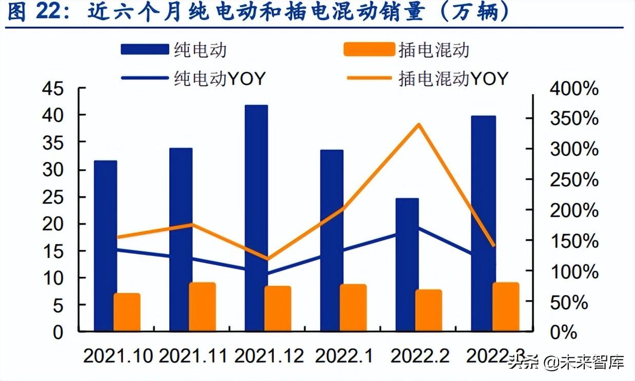 近五年 BEV、PHEV 和 HEV 销量均高速增长,2021 年 BEV 销量达 237 万辆,同比增长 162%; PHEV 销量达 53 万辆,同比增长 151%;HEV 销量达 110 万辆,同比增长 40%。我们认为在未 来几年内,随着新能车产品力的增强和产品线的丰富,以及充电设施的不断完善、充电难问题逐 步得到解决,BEV 销量会保持高速增长;随着搭载新一代混动系统车型的不断推出,兼具省油且 没有里程忧虑的 PHEV 和 HEV,可以推动部分燃油车车主向电动车进行切换,销量增强确定性 强。(报告来源:未来智库)
