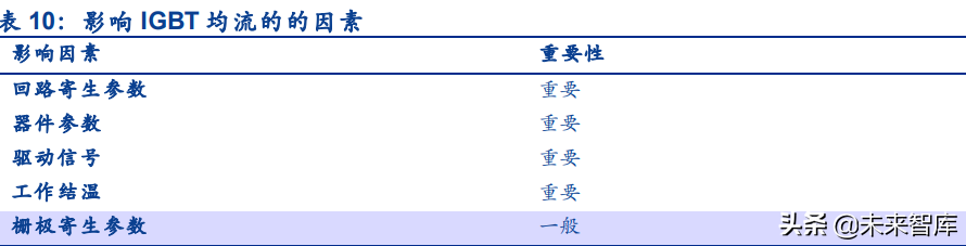 IGBT 并联方案技术壁垒较高:1)电流一致性问题,需要使得每一个 IGBT 单管通过的电流 完全相同,因为只要有一个单管出现问题,就会加剧其他管子的工作负荷,甚至失控;2) 温度一致性问题,由于每个单管布臵位臵和参数一致性等问题,会导致单管温度不一致从而 影响性能发挥。我们认为,两种方案在未来仍将处于共存的状态,但是 IGBT 单管并联的方 案渗透率有望逐步提升。IGBT 单管并联方案的优势明显,但是峰值输出功率越大,并联的 IGBT 芯片数量越多,一致性的控制难度越高;IGBT 模块的方案功率密度和效率相对较低, 但是可靠性相对较高,并且已经在大部分新能车上批量使用。