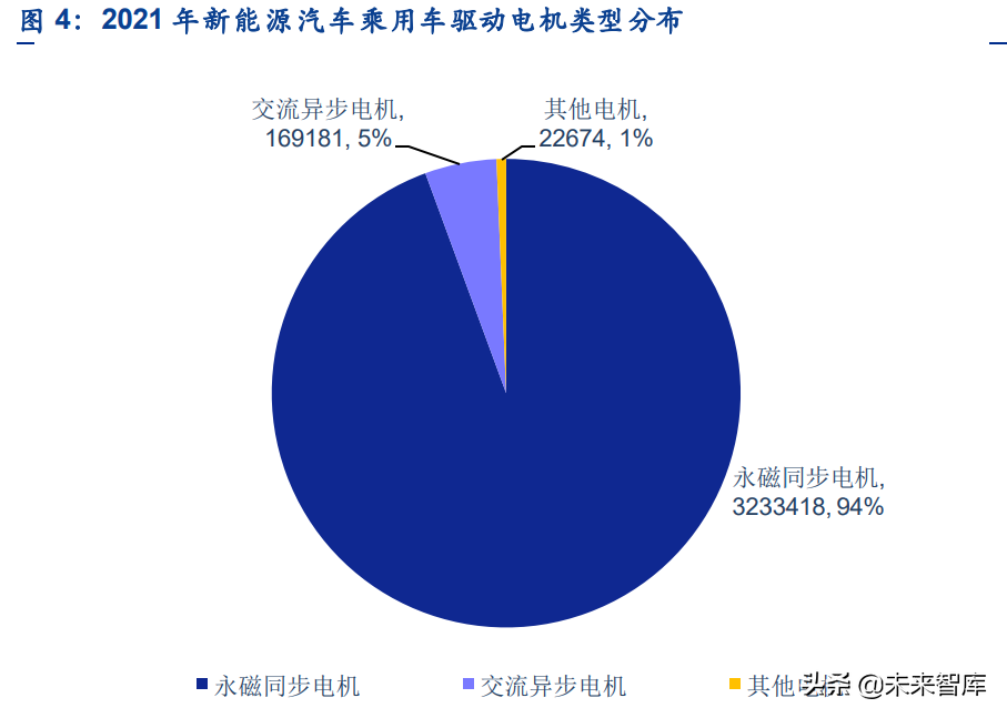 2021 年国内新能源汽车乘用车驱动电机市场共装配 342.5 万台电机,其中永磁同步电机占 323.3 万台,占比约为 94%,交流异步电机占比约为 5%,国内的驱动电机市场仍以永磁同 步电机为主,主要原因包括:1)国内稀土资源较为丰富,供应链资源丰富;2)新能车发展 初期仍以单电机的车型为主,需要相对较大的输出功率和扭矩。纯电动车型中的双驱动电机 版本,配套一台异步电机和一台永磁同步电机的车型较多,随着双电机车型的占比增加,我 们认为,异步电机在国内的市场份额仍有一定提升的空间,永磁同步电机仍是行业主要的驱 动电机类型。