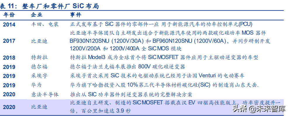 零部件及整车企业纷纷布局 SiC 器件:2018 年,特斯拉 Model 3 成为全球首个将 SiC MOSFET 器件应用于主驱动逆变器的车型;2019 年,华为旗下哈勃投资入股第三代半导体 材料碳化硅制造商山东天岳;2020 年,意法半导体推出从 SiC 功率器件到逆变器系统的完 整解决方案;2020 年,比亚迪汉 EV 搭载其自主研发、制造的 SiC MOSFET,使其零百加 速达 3.9s。2021 年 4 月,比亚迪 e 平台 3.0 将搭载全新一代 SiC 电控系统,功率密度提升 30%,最高效率 99.7%。据比亚迪官网,预计到 2023 年,比亚迪将在旗下的电动车中,实 现 SiC 基车用功率半导体对硅基 IGBT 的全面替代。