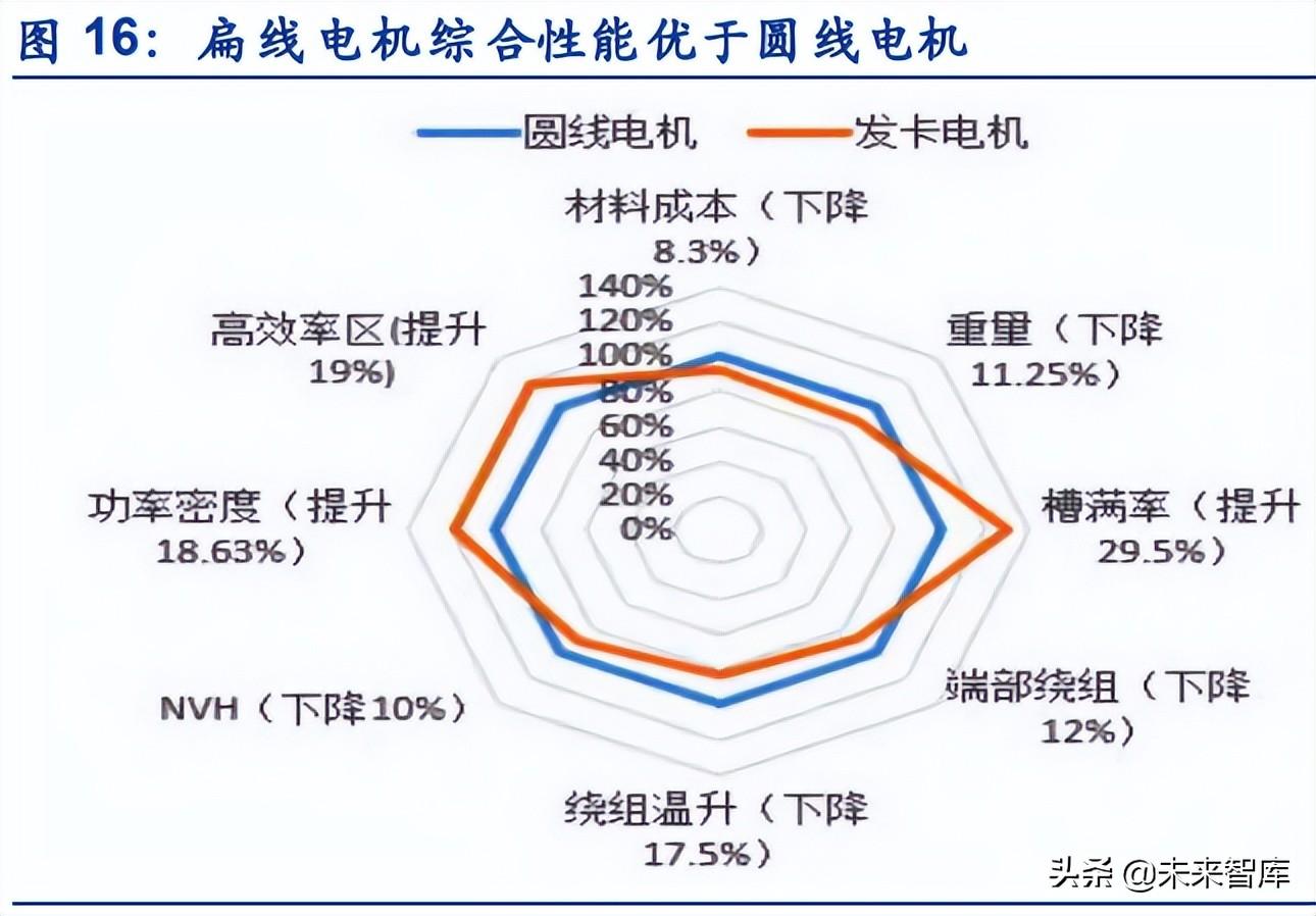 1)效率高:①截面设计提升槽满率,扁线电机截面为方形,空间利用率高,裸铜槽满率较 圆形电机可提升 20%-30%,能有效降低绕组电阻进而降低铜损耗;②端部尺寸更短,与圆 线电机绕组相比,扁线电机端部总高度缩短 5-10mm,可有效降低端部绕组铜耗,进一步提 升电机效率;截面设计+缩短端部尺寸等结构设计,可以让扁线电机的平均效率较传统圆线 提高 1%以上;